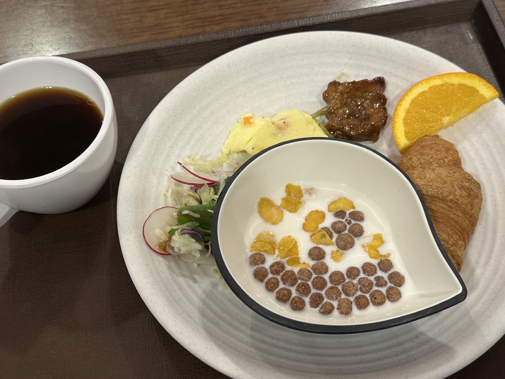 그 다음날 조식은 7시부터 8시20분까지 식당이 열립니다 저는 따로 야식을 먹어서 이날나온 조식을 안먹었는데 라면도 있었고 한식 식사도 있었습니다 조식답게 토스트와 잼, 버터, 따뜻한 아메리카노도 있습니다 저는 크루아상과 시리얼을 가져왔는데 크루아상은 결대로 찢어지는 그런 크루아상은 아니니 참고해주세요